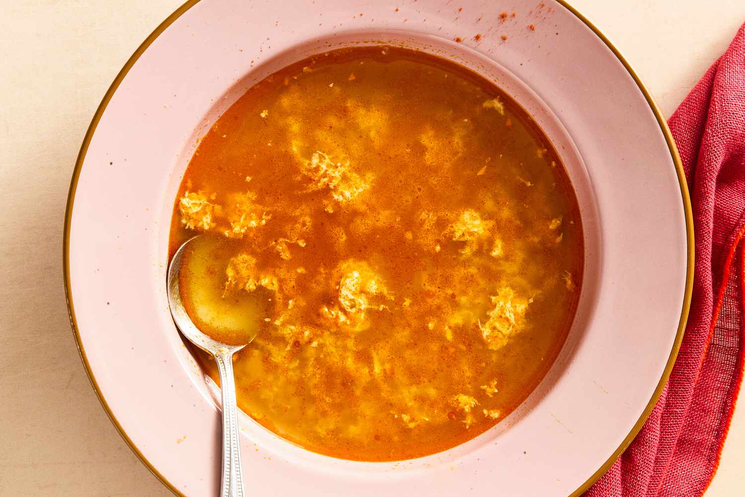 - While stirring the soup gently, slowly pour the beaten eggs into the pot and let stand five minutes.